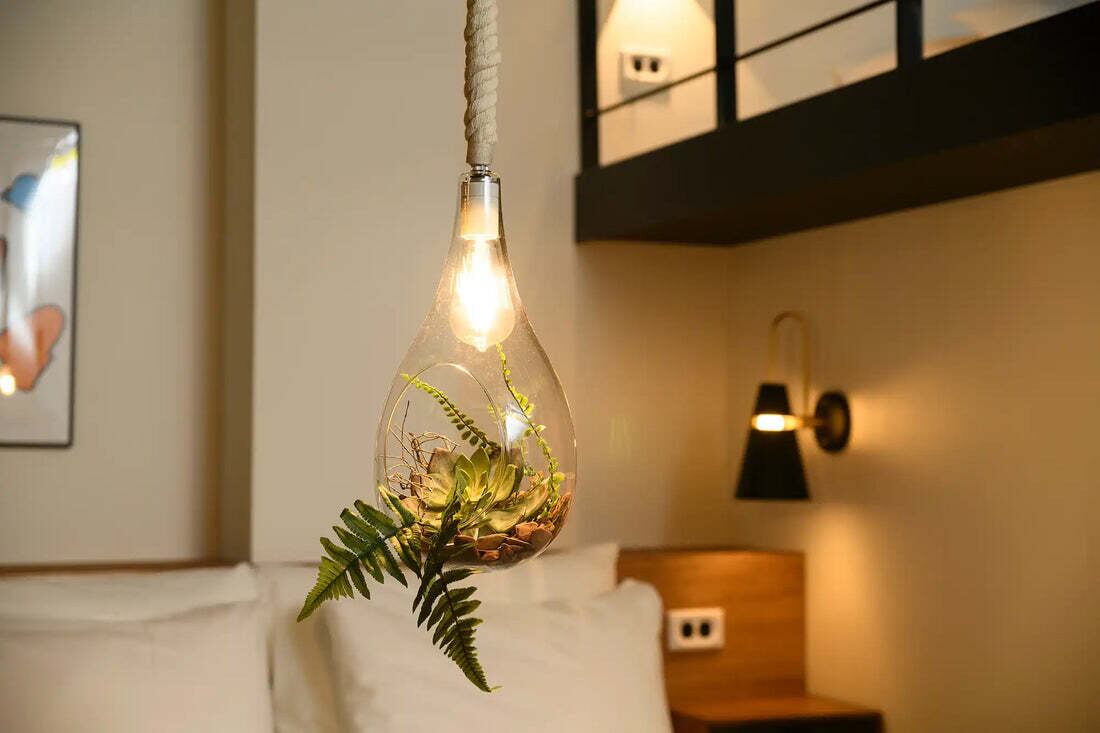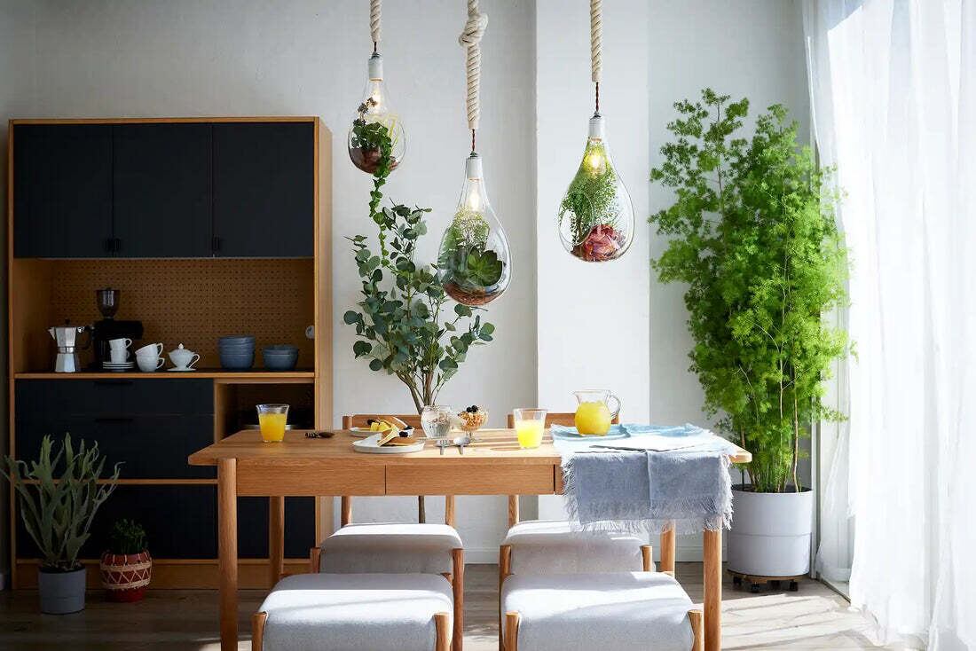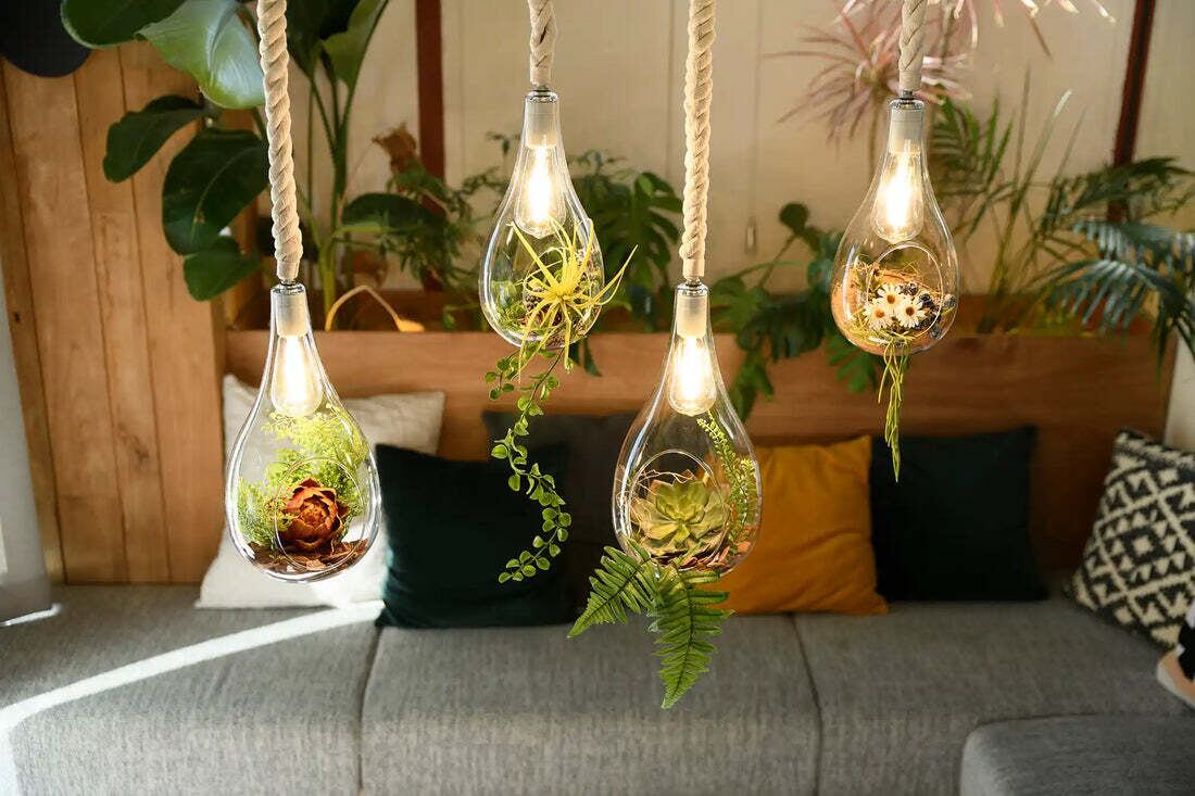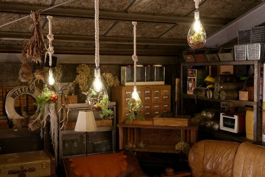 熱の少ないLED電球なので、植物を入れても安心。あたたかみのある電球色で、寝室やリビングなどのリラックス空間に最適です。