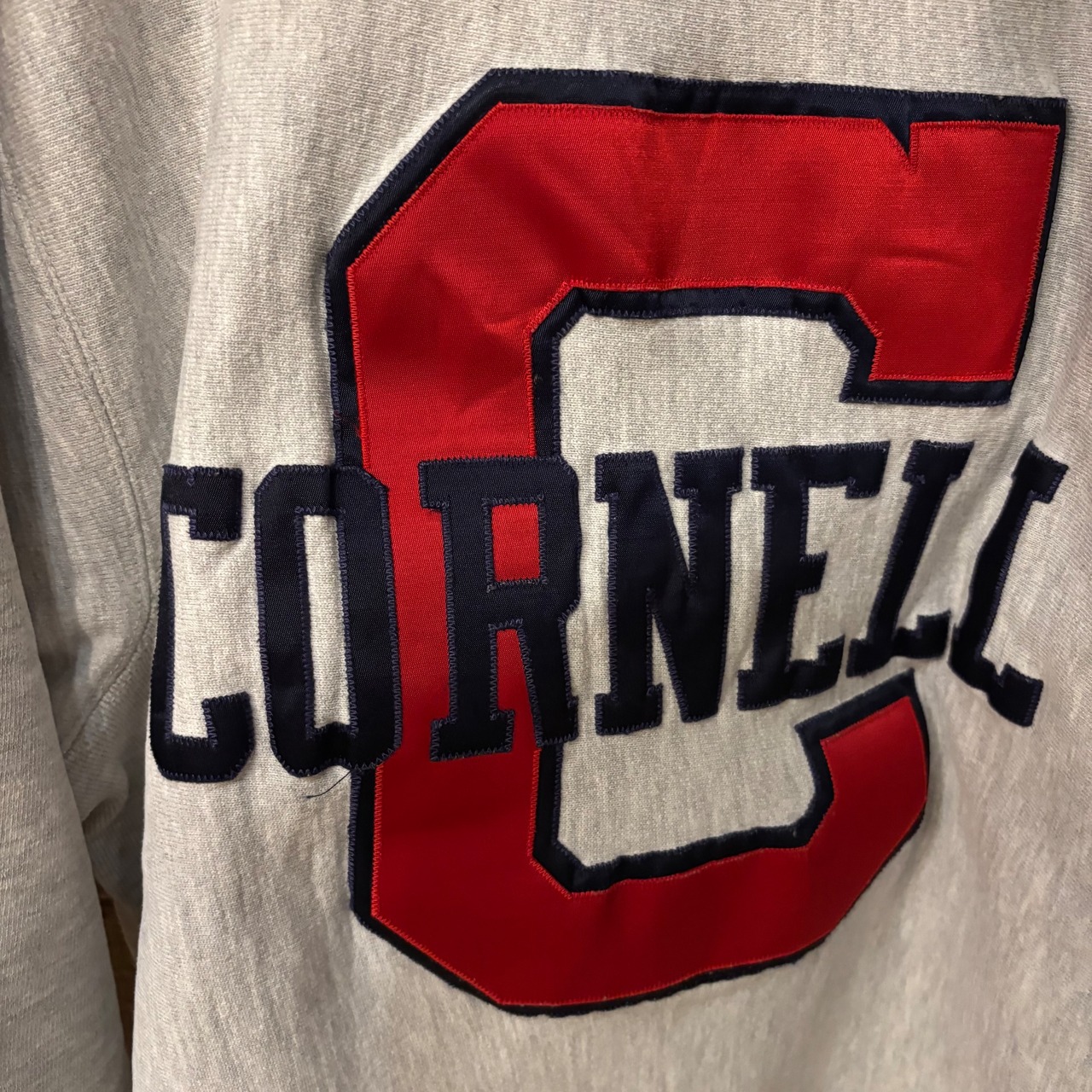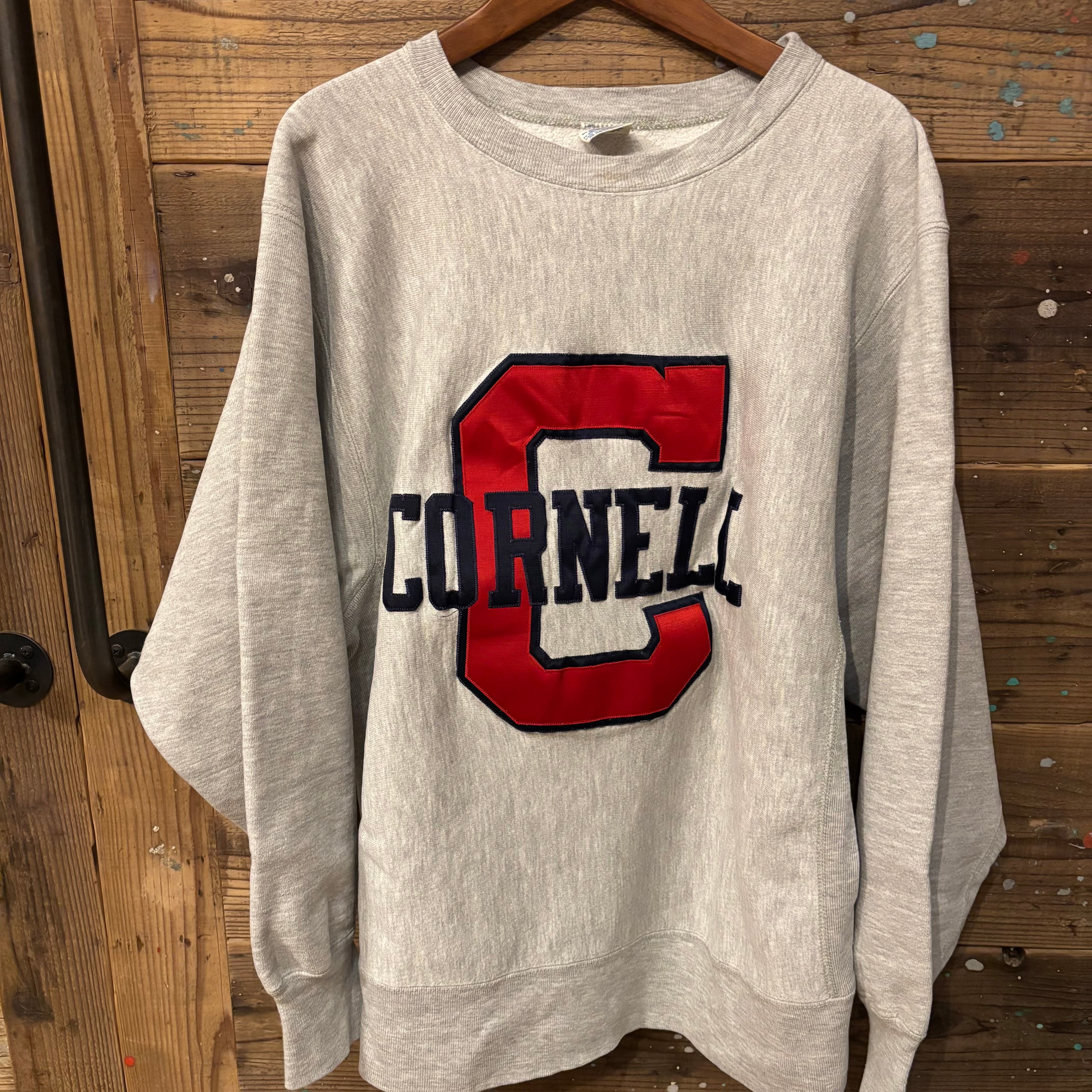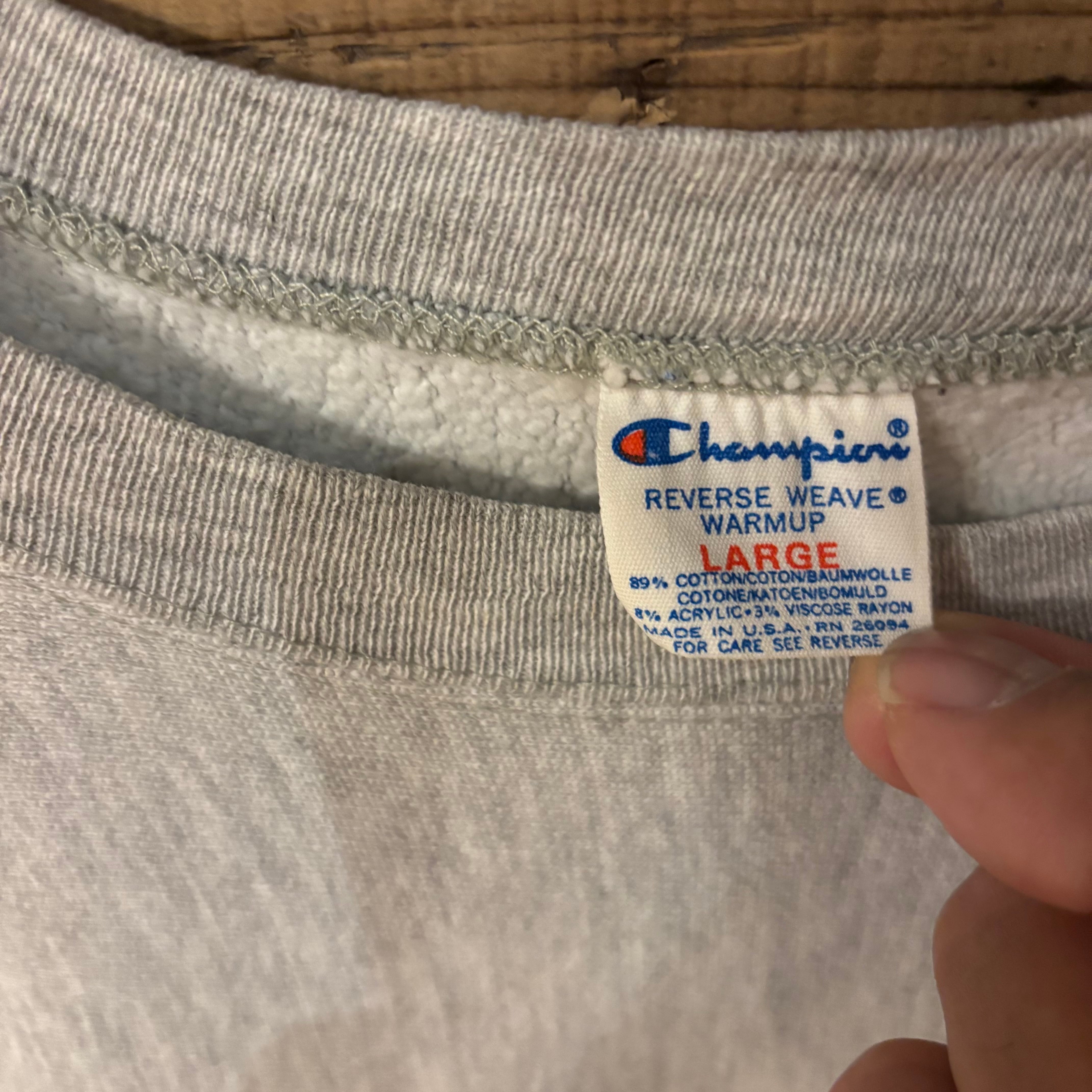 ChampionのグレーのReverse Weaveトレーナー、CORNNELLナイロン製のロゴ付き、Lサイズ。